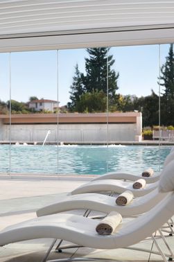 Spa-Partnereinrichtung angrenzend an das Resort: Thermarium mit Bioaquam-Thermalpool, finnischer Sauna und Dampfbad. 750qm Thermalaußenpool mit Hydromassagedüsen und Wasserfall, Bioaqaum-Pavillon mit überdachter Fläche im Winter.