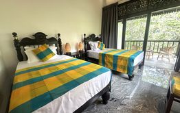 5 großzügige Einzel- oder Doppelzimmer und 3 geräumige Doppel- oder Twin Suiten befinden sich im Haupthaus. Im neuen Yoga House nebenan gibt es direkt neben der großen Yoga-Shala 3 weitere Zweibett-Zimmer. Alle Zimmer und Suiten verfügen über Klimaanlage und Deckenventilator, Moskitonetze, Mini Kühlschrank, Safe, Pflegeprodukte, Föhn, hochwertige Möbel, luxuriös ausgestattete Badezimmer und einen herrlichen Blick in die Natur, die meisten davon mit privatem Balkon. Kissen für Allergiker auf Anfrage erhältlich. Die Einzelzimmer sind Doppelzimmer zur Alleinnutzung.
