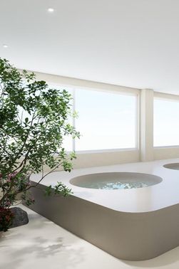 Outdoor : Entdecken Sie eine ruhige Oase, die zum Entspannen unter der mediterranen Sonne einlädt. Tagsüber dient sie als erfrischender Rückzugsort, an dem Meerwasser und Sonnenlicht den Körper revitalisieren; nachts verwandelt sanfte Beleuchtung die Pools in eine magische, fast ätherische Umgebung - ein perfektes Zusammenspiel von Natur, Licht und Architektur.